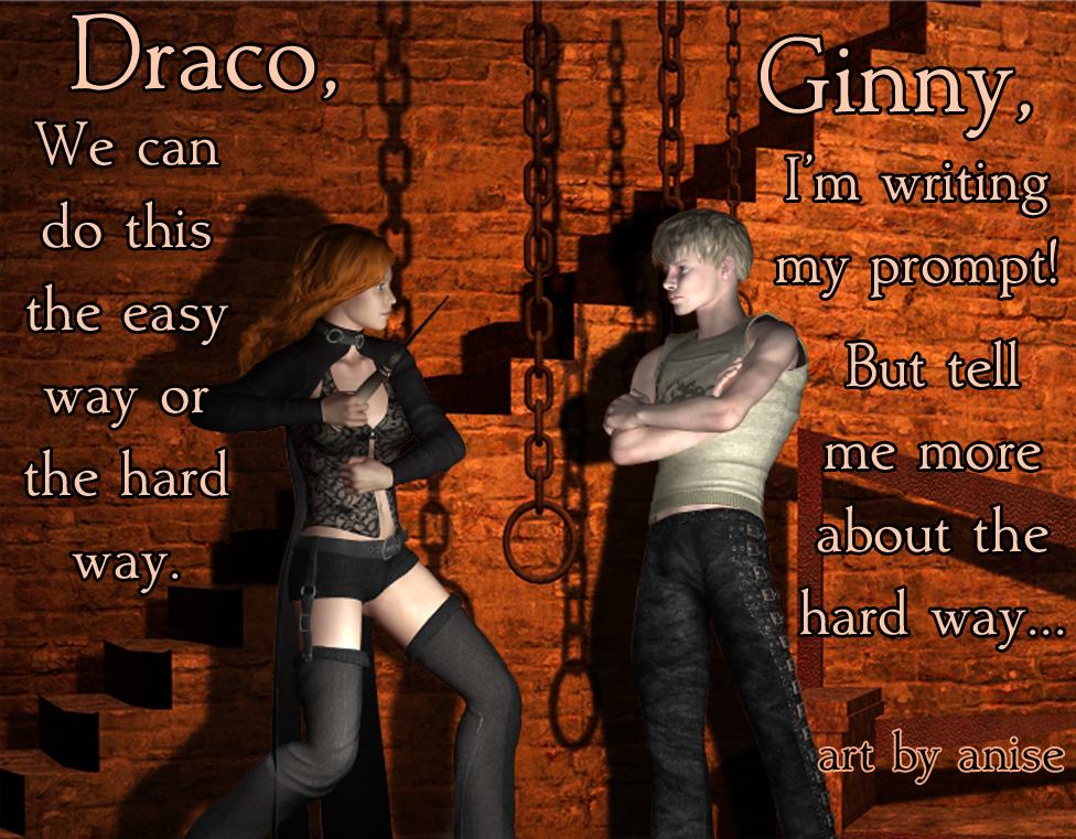 For more inspiration, here’s the first of a two-part graphic series with Draco and Ginny. This entire thing might eventually develop into a graphic novel, for all I know. 😉 Wow, I really worked on this one, and I’m still not totally happy with it. There were originally some horrible shadows that had to be taken out, and then the background wasn’t in the right focus, and etc etc and etc… oh, and Ginny’s skirt is HAND PAINTED BY ME.